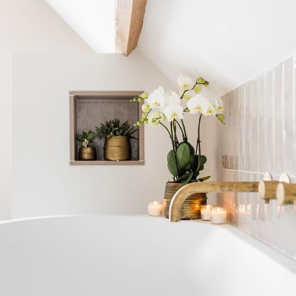 - Lieferumfang: Weiße Orchidee und zwei Sukkulenten in goldenen Töpfen + Dekorations Elefant