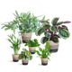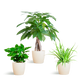 Größe und Wachstum: Die Pflanzen erreichen je nach Art eine Wuchshöhe von etwa 25 bis 50 cm. Die Calathea wächst buschig mit samtigen Blättern, die Krulvaren präsentiert feine, gekräuselte Farnwedel. Die Goldpalme wächst aufrecht mit federartigem Laub, während die Grünlilie mit ihren überhängenden Trieben ideal für hängende Platzierungen ist.
