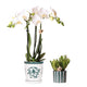 Verleihen Sie Ihrem Interieur einen Hauch von Eleganz mit diesem stilvollen Set. Dieses Set kombiniert eine gelbe und eine rote Phalaenopsis-Orchidee mit einer trendigen Rhipsalis-Pflanze. Die Pflanzen sind sorgfältig auf einem edlen goldenen Tablett arrangiert, das sofort eine luxuriöse und warme Atmosphäre schafft. Perfekt für ein Wohnzimmer, einen Essbereich oder eine elegante Bürodekoration.