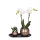 Größe und Wachstum: Die Orchidee erreicht eine durchschnittliche Höhe von 40 cm inklusive Topf und verfügt über 2–3 Blütenstiele. Die Sukkulente ergänzt das Set mit ihrem kompakten, modernen Wuchs.