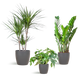 Größe und Wachstum: Die Pflanzen erreichen je nach Art eine Wuchshöhe von etwa 25 bis 50 cm. Die Calathea wächst buschig mit samtigen Blättern, die Krulvaren präsentiert feine, gekräuselte Farnwedel. Die Goldpalme wächst aufrecht mit federartigem Laub, während die Grünlilie mit ihren überhängenden Trieben ideal für hängende Platzierungen ist.