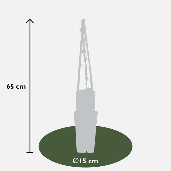 Größe und Wachstum: Aktuelle Höhe ca. 65 cm bei einem Topfdurchmesser von 15 cm. Die Pflanze wächst kletternd bis zu 2,5 m hoch und benötigt eine Rankhilfe. Kompakter Wuchs mit dichter Verzweigung.